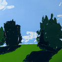 The artist often works on a very small scale. Her pocket-sized paintings take on new meaning when viewed as a large group. Each landscape is painted in one sitting from a picture taken by the artist, and groupings of her paintings read like photo albums, documenting where she has been.